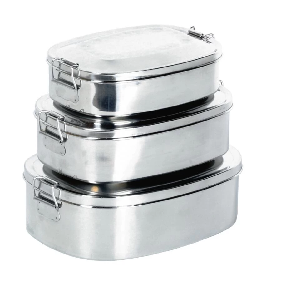 Praktische voorzorgbox van roestvrij staal in 3 maten. Het deksel wordt op de doos gehouden met 2 rolklemmen. Perfect voor brood, fruit of proviand. Maar ook geschikt voor kleine spullen, fotoaccessoires, eerste hulp kits, als spaarpot of voor de schoenpoetskit. Kan ook gebruikt worden in geval van nood op vlammenkokers (dan het deksel niet vastzetten). Zonder zegel.