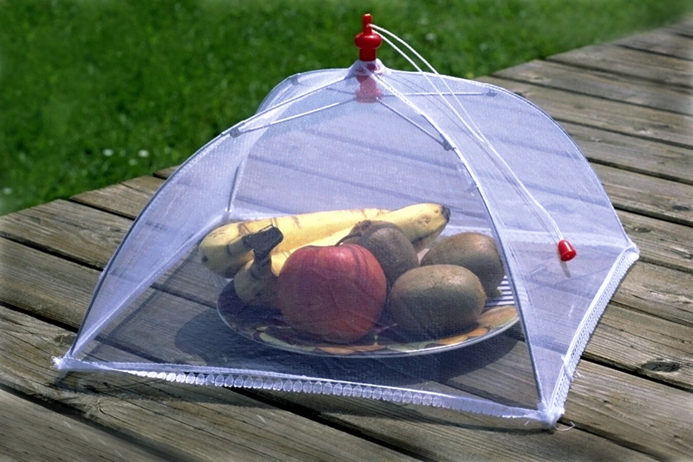 De nylon muskietennetelkap beschermt uw voedsel tegen opdringerige insecten. Gewoon over het eten plaatsen. Kan klein worden opgevouwen voor transport. Onderstel 33 x 33 cm.