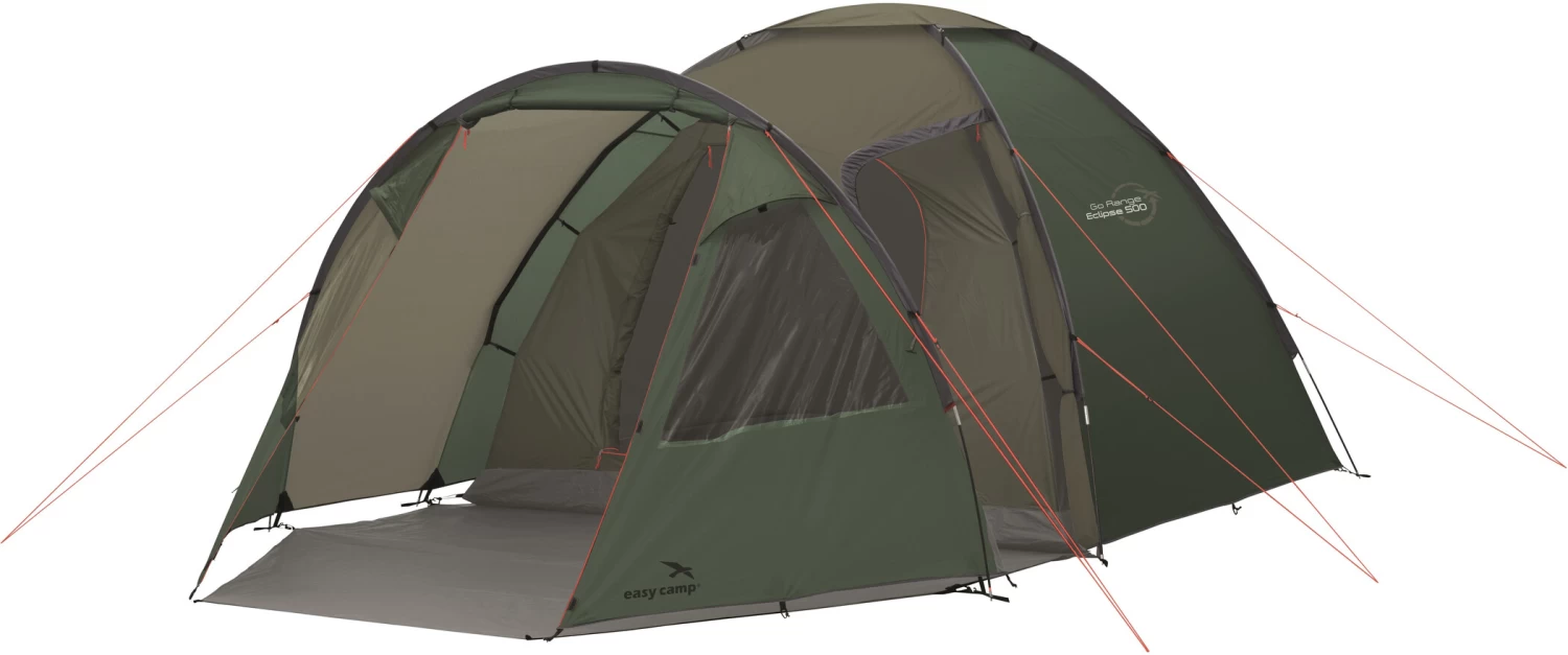 De Eclipse 500 koepeltent biedt comfortabel plaats aan vijf personen. Het heeft een derde boogstok, waardoor een grote verlengde vestibule ontstaat met 180 cm stahoogte voor de hoofdtent. Deze nuttige leefruimte heeft een tentvloer en veel bergruimte voor fietsen en andere essentiële buitenspullen. De grote leefruimte, ruime slaapcabine en kleine pakmaat maken deze tent de ideale oplossing voor kampeerders die met een kleine auto reizen. De tent kan worden betreden via de voordeur of de zijdeur. Twee ramen en de bijbehorende ventilatieopeningen zorgen voor de beste lichtinval en optimale luchtcirculatie in de vestibule.