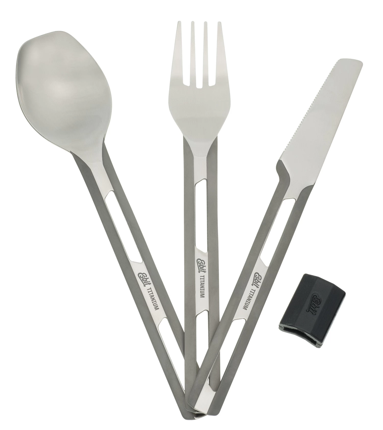 Deze universeel toepasbare, robuuste bestekset van titanium bespaart op de juiste plaats: Door het gewicht. Het is extreem licht en door zijn buitengewone ontwerp ook een visuele blikvanger. Eet- of snijvlakken worden uitvoerig gepolijst. Een hittebestendige, slipvrije siliconen hoes houdt het bestek bij elkaar als het niet in gebruik is.