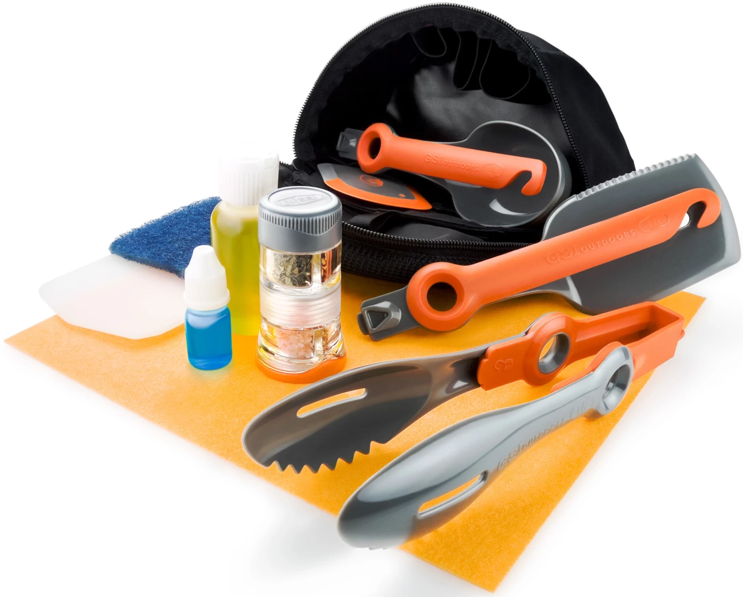 Keukenset met enkele helpers: uitklapbare kooklepel, uitklapbare pannenlift, handdoek, spons, een 4-kamer specerijenshaker, snijplank, zeepfles, oliefles en een reinigingsschraper voor gecoate potten en pannen. Door de halfronde vorm van de meegeleverde draagtas past de gehele set perfect in een 2 L pot van GSI.