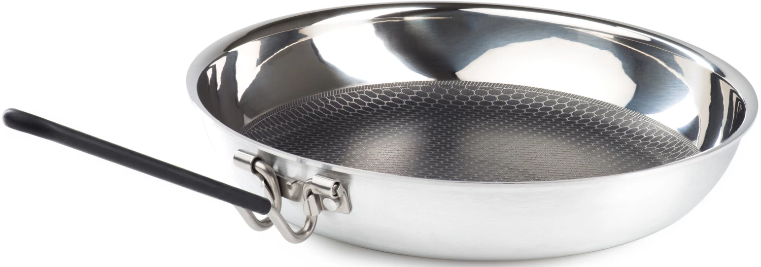 Hoogwaardige roestvrijstalen pan met aluminium kern voor een uitstekende warmtegeleiding. Het binnenoppervlak is gemaakt van roestvrij staal met een extreem duurzame antiaanbaklaag om het koken en schoonmaken kinderspel te maken. De opvouwbare handgreep is voorzien van een siliconen coating, zodat u de pan altijd veilig in de handgreep heeft en er geen risico is op brandwonden.