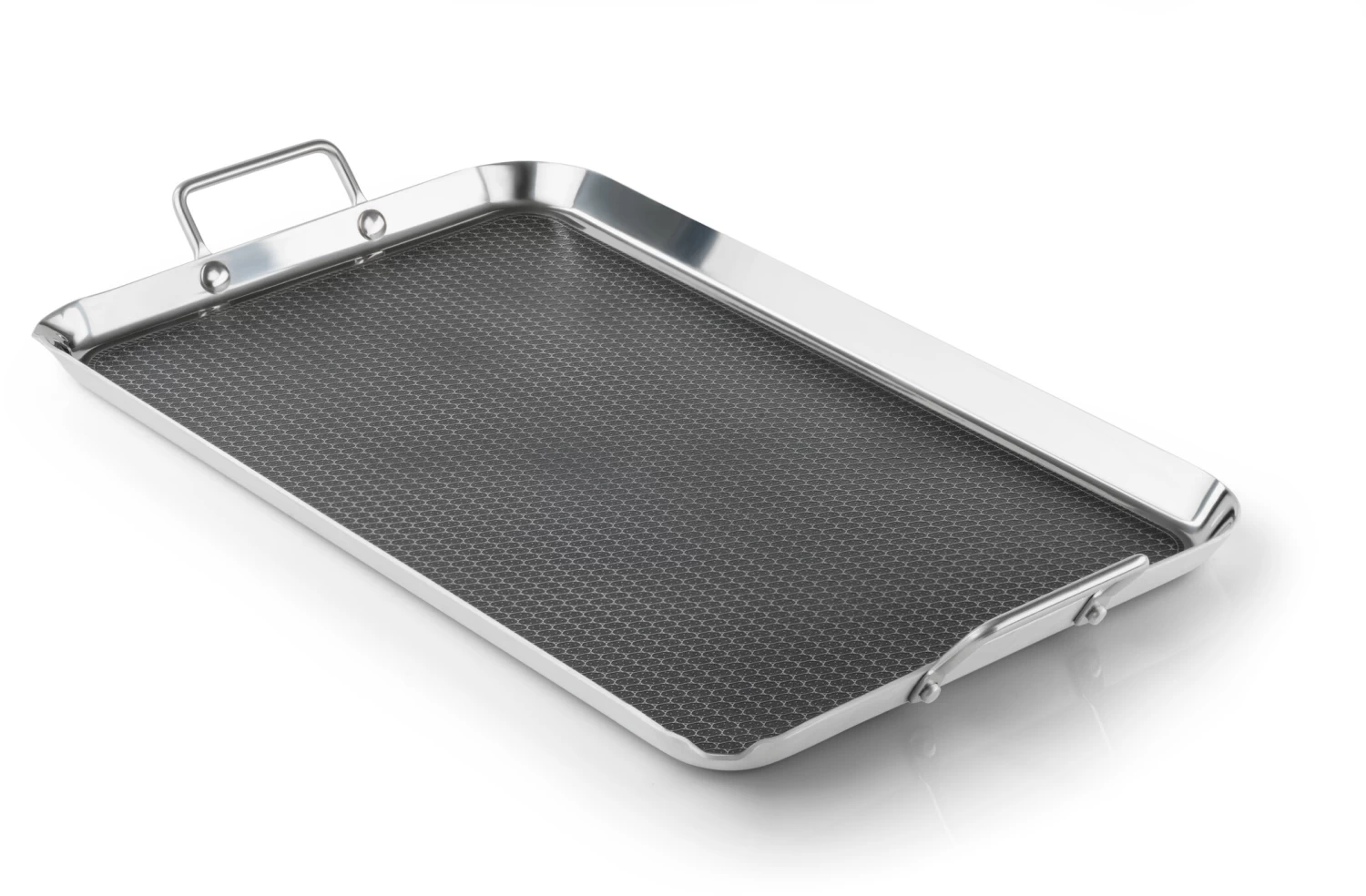 De praktische en duurzame campinggrillplaat van roestvrij staal 304/18 is bekleed met een dikke, warmtegeleidende aluminium vloer. Het heeft extra gelaserde compartimenten gemaakt van een PTFE anti-aanbaklaag. De combinatie vermindert de haarden en verhoogt de krasbestendigheid, vooral bij het gebruik van metalen kooktoestellen, en is ontworpen voor gebruik op twee- of driepits gasfornuizen. De handgrepen vergemakkelijken het heffen en verplaatsen van de plaat.