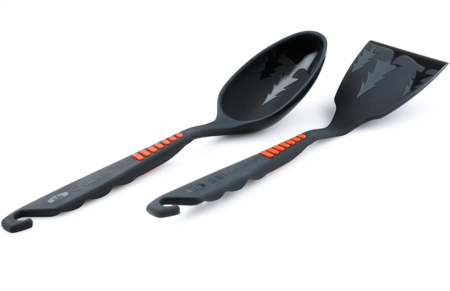 De compacte en lichte kookset met siliconen handgrepen maakt het gemakkelijk om te roeren, te scheppen, te bakken en te serveren. Het is gemaakt van duurzaam, versterkt, hittebestendig nylon en een geïntegreerde haak maakt het gemakkelijk om de lepel en spatel op te hangen.