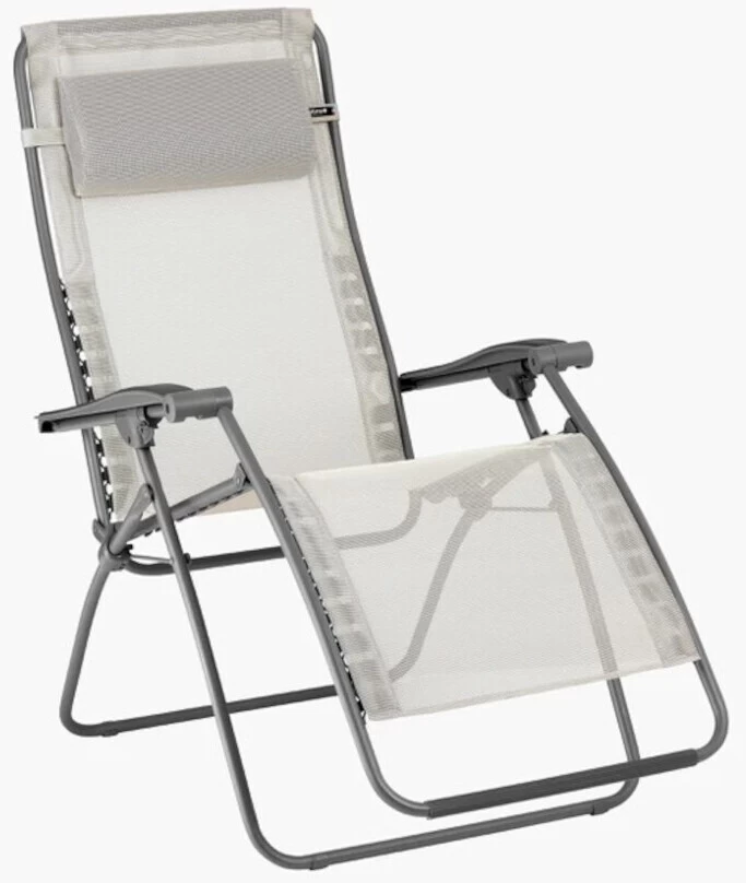 The Lafuma RSXA Clip recliner has a frame made of painted 20 mm Ø steel tubing. The position of the armrests can be infinitely adjusted, the position is fixed by a parking brake. The cover is removable, the suspension and fastening of the cover is done by the patented clip system. The chair also has an ergonomic, adjustable and removable headrest cushion, a footrest protector and a floor protector.