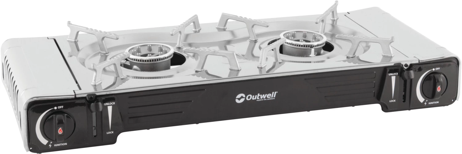 Two-burner piezo ignition stove, each powered by its own easily obtainable gas cartridge for versatile convenience, offers a practical cooking option perfect for groups and families on the move, on the beach or for emergency use.