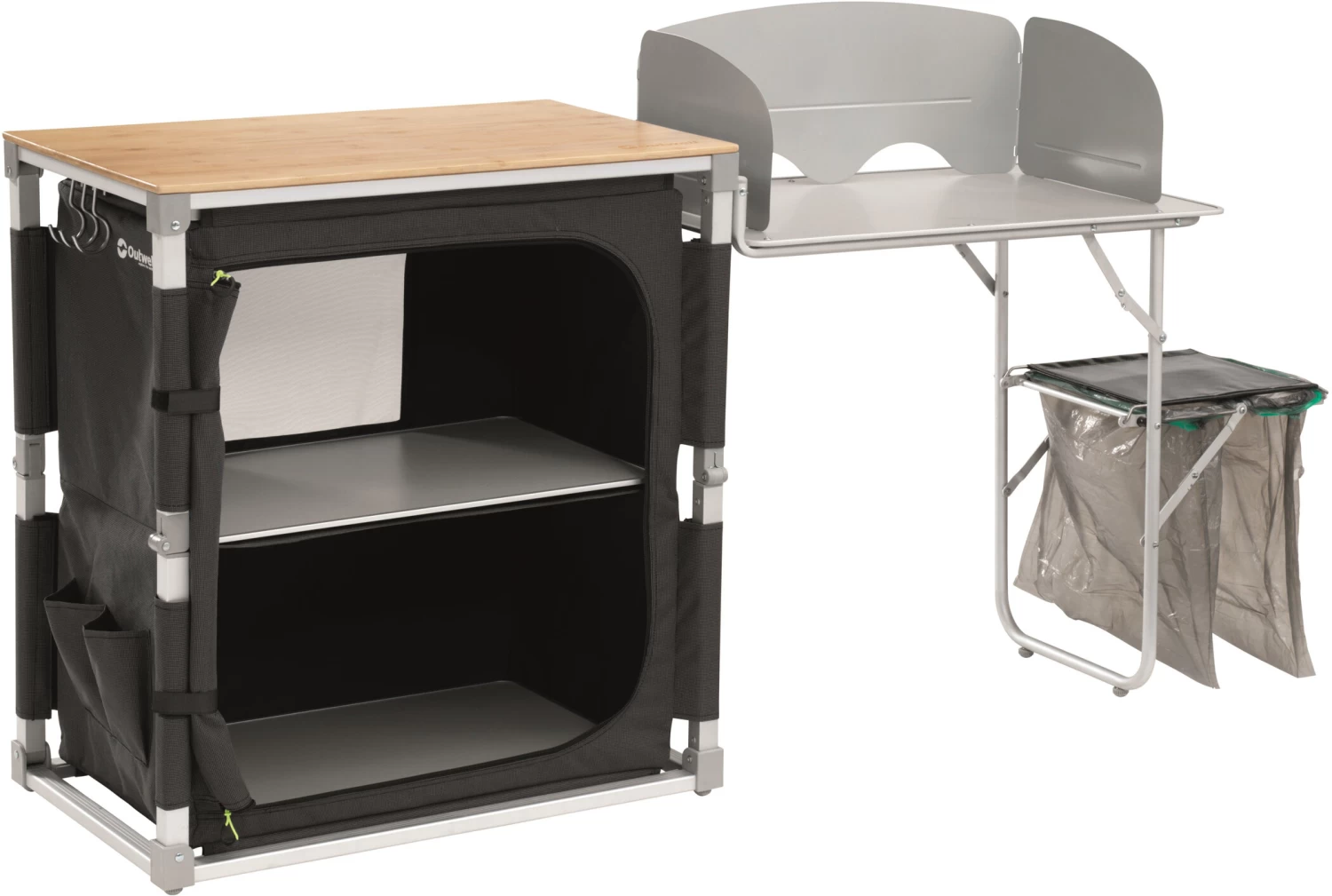 De ultieme mobiele keuken! Eenvoudig eten voorbereiden, koken, afwassen en opruimen met de Padres keukentafel & zij-unit. De unit staat in een handomdraai, zodat u een groot bamboe werkblad, zijtafel, windscherm, uittrekbare afwasbakhouder en vuilnisbak met deksel hebt. De handige zijzakken zijn ideaal voor keukenbenodigdheden en kruiden. De tafel wordt na gebruik eenvoudig ingeklapt en opgeborgen in de draagtas.