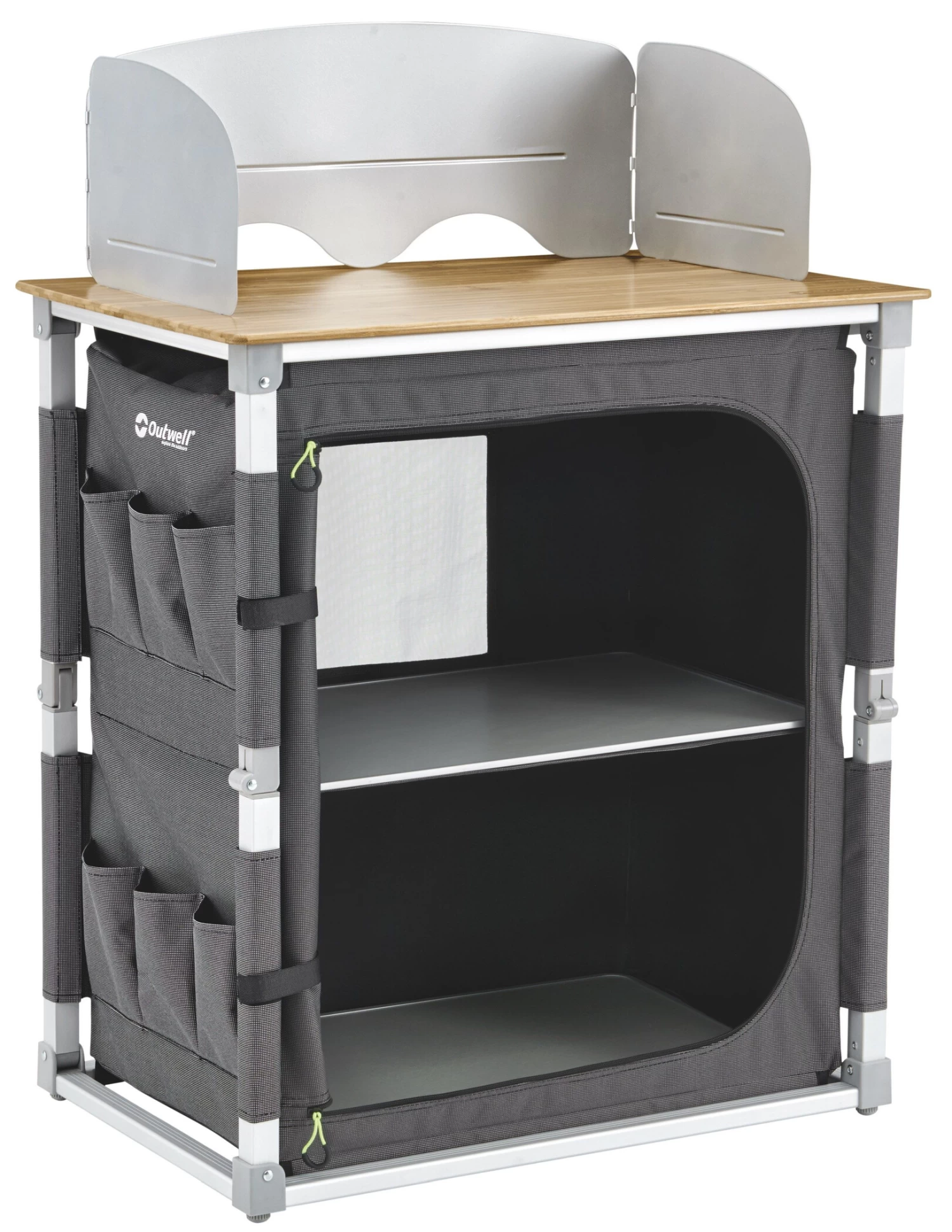 Van stijlvol zwart/grijs materiaal met een stevige bovenkant van bamboe en drie handige haken aan de ene kant en een opbergvak aan de andere kant. De keukentafel heeft een uittrekbare houder voor een afwasteil of vuilniszak en een windscherm om de vlammen van de brander tegen de wind te beschermen.
